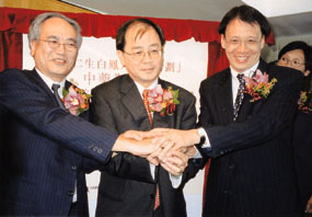 香港中文大學中醫中藥研究所管理委員會主席梁秉中(左)、創新科技署署長何宣威(中)及余仁生(香港)有限公司執行董事余義方(右)昨日共同宣布合作研究計劃。