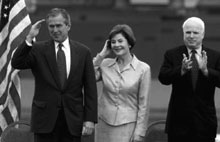 「這也閉O第一個夫人比候選人更引人注目的總統競選年」,美國的一位時事評論員這樣認為。的確,自得克薩斯州州長小布什成為共和黨的總統候選人後,五十三歲的妻子勞拉•布什就為丈夫入主白宮而四處奔波,為時尚雜誌拍照、在集會上發表演講、一天接受三十二次電台訪問……總統副總統候選人中沒有女性,候選人的妻子就成為吸引女性選民的「王牌」。