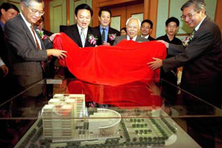 北京大學、香港科大和深圳市有關負責人為共同成立的深港產學研基地大樓模型揭幕。 (新華社傳真)