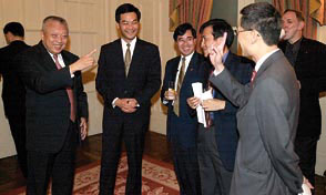 董建華在餞行酒會上與專業人士交談。