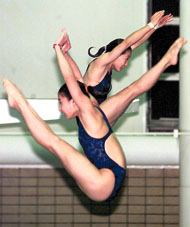 伏明霞與郭晶晶在進行雙人跳水表演。