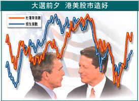 至於港股,美國選舉結果不會令港股大幅波動,短期亦不會有重要的影響。不過,若布什當選,長遠來說,將會稍為抵銷中國加入世貿的樂觀市場情緒。