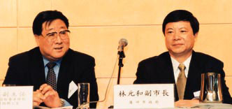 在廣州高科技重點項目情況介紹會上,圖為中央駐港聯絡辦公室副主任高祀仁(左)及廣州市副市長林元和(右)會見記者。