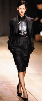 圖中的模特兒們所穿著的都是充滿男性味道的設計:恤衫、結皮領帶,可外罩墊膊西裝外套。即使是下身配上半截裙子,仍然有著濃濃的男裝味道。