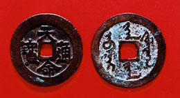 若時下人重提「天命」錢之神孕略犐荅爾隉A但如要領略一下其廬山真面目,只要看一看附圖便明了。「天命」錢是一對滿漢文小平錢,漢文一品「天命通寶」與歷代錢幣全無二致,就算滿文一品亦同是方孔錢的形式,只不過錢文換上了滿文罷了。滿文的錢文左邊滿語讀「阿舖開」意為「天」;右邊讀「福靈阿」意為「命」;上邊讀「汗」意為「五」;下邊讀「幾哈」意為「之錢」,整個錢譯作「天命汗之錢」。