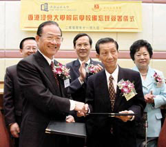 【本報訊】浸會大學計劃在校園內興建附屬學校,最近獲金城營造集團慨允捐贈港幣一千萬元,以作建校經費。雙方昨天假浸會大學舉行備忘錄簽署儀式。浸會大學校長謝志偉在儀式上表示,浸大重視教育改革,開辦附屬學校的理念是希望學生能夠在一個不受太多外來干擾的環境中積極及成它a去學習,以及培訓學生兩文三語的能力。這個理念得到政府的鼓勵及支持。浸大的教育學系在語文政策及語文教學方面表現出色,由浸大開辦附屬學校是非常合適的。