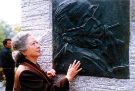老演員林默予(電視劇《紅樓夢》中飾演賈母)在夏衍雕塑前。