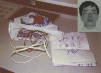裝修判頭自殺用的電線及寫下的字跡,小圖為死者。