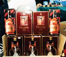 海關人員根據線報,昨午十二時左右掩至深水步荔枝角道一○四號二樓一單位,未幾,兩名目標男子從單位離開,海關人員認為時機成熟,一湧而上將兩名男子制服,海關人員將兩名男子押返單位搜查,檢獲十九瓶懷疑假洋酒,大批空酒樽及包裝盒(包括軒尼詩XO、人頭馬VSOP、長頸FOV、芝華士及馬爹利等),估計約有八十個空樽。另外,亦搜出用作稀釋的廉價拔蘭地、純酒精及含色素酒精等,全部約值六千元。
