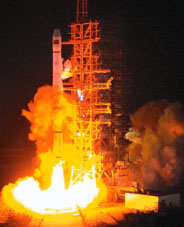 十二月廿一日零時二十分,我國自行研製的「北斗星導航試驗衛星」在西昌衛星發射中心由「長征三號甲」火箭發射成央A準確進入預定軌道。至此,我國擁有了自主研製的第一代衛星導航定位系統。這是發射現場。(新華社)