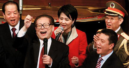 在慶祝澳門回歸祖國一周年大會文藝演出後,江澤民主席走上舞台,高歌一曲,贏得滿場掌聲。 (法新社傳真)