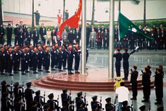 儀式開始前,警察樂隊以及由治安警、消防警和水警組成的方隊邁著整齊的步伐進入廣場。行政長官檢黎頞井寣A升旗儀式正式開始。伴隨著激昂的樂曲,四名特警隊員分別手捧國旗和特區區旗,健步走進廣場,兩支英姿颯爽的特警小隊分列護衛在旗桿兩側。