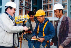 港九建造業總工會理事長蔡鎮華(左一)及職金局職員在天水圍向建造業工友派發宣傳品。