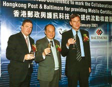 香港郵政與護訊科技公司簽訂諒解備忘錄,率先在亞洲提供無線傳送層保密流動核證機關服務。護訊科技行政總裁Fran Rooney、香港郵政署長陸炳泉及護訊科技北亞地區副總裁兼總經理Greg Lenisten互相祝酒慶祝。