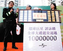 譚詠麟昨日出席「愛自己愛別人」愛心頭巾大行動活動,在活動上,他所屬的唱片公司更特別送了一個牌匾給阿倫,因為他的總唱片銷量衝破一千萬張。不過,心水清的阿倫表示衝過二千萬張才對,因為早在八九年,他的唱片總銷量已經超過一千萬張。