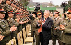 昨日,香港特別行政區行政長官董建華率領特區政府部分官員來到解放軍駐香港部隊軍營,慰問部隊官兵,並觀看了官兵們的軍事課目表演。圖為董建華先生向駐軍英雄連隊「大渡河連」的官兵表示慰問。 (新華社)