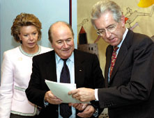 歐盟委員蒙蒂(右)把轉會方案協議書遞交給國際足聯會長白禮達(中)。 (美聯社)