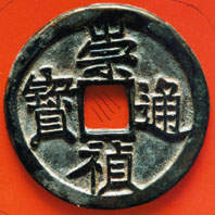 不過崇禎帝留存於世上大量鑄錢,可讓後人從另一側面窺探這位末路君王之無奈。時下所見各種型制、版別「崇禎通寶」頗為豐富,事因明季白銀已是主要貨幣,朝廷頒有固定銀、錢比價,使錢之作價大大高於本身實際價值,故此鑄錢收益豐厚。為獲利籌軍餉,崇禎在位時不停開爐鼓鑄。鑄錢要有銅源,窮於應付、無計可施之崇禎帝一來收銷舊錢鑄新錢,二來竟使出為人詬病手段,令將內府所藏歷朝銅器交由京城寶源局熔毀,再翻鑄新錢。如圖之這一枚「崇禎通寶」,其前身難講不是商、周、戰國或宣德時之彝、鼎、鹵、鬯,以及赫赫有名宮室珍寶宣德爐之一部分。《明史集腋》對此有這樣句子表述:「於是古器毀棄殆盡」,一人之錯而置數千年文明蒙難,行筆至此,不禁使人扼腕太息。