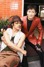 昨早先拍反町隆史扮攝影記者來掩飾殺手身份,向途人開槍,而反町在戲中的造型,均是他從日本請專人設計,再由導演過目,昨日他便戴了頂啡色闊邊帽,不過旁邊有個小蝴蝶結,似是女裝帽,但他穿了件背心,顯得相當健碩。