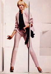 進一步突出的是,誇張透頂的腰封式腰帶,從胸部到腰下的纏帶、肩部至臀部的布帶,意念創新,不拘一格,揮灑自如,一如現代女性的工作能力。 梅蘭