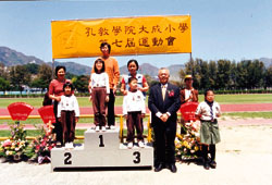 湯博士並向參加親子比賽的家長致謝,勉勵各同學要尊敬家長與師長,努力學習發揚孔道。頒獎禮後由該校校監顧思聰副院長致謝詞,是日出席陸運會者逾千人。