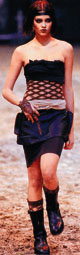 模特兒們所穿在腳上的不是一般的高跟鞋,而是極為笨重的黑色靴子,以配襯heavy metal感覺的魚網設計。 Hanako