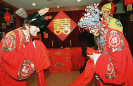 法國中部地區法中協會主席拉代先生,十一日在北京大觀園酒店與中國姑娘張陶舉行隆重的中式婚禮,他因喜歡中國文化而鍾情中國姑娘,還因喜歡中國名著《紅樓夢》因此選擇大觀園酒店與新娘拜堂成親。 (中新社)