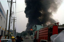 台北市西南一百公里的新竹工業園一間化工廠周五發生大火,冒出濃煙。相信大火是由爆炸引起,至少一人死及逾百人傷。 (美聯社)