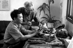 福建省東山島縣博物館近年來通過台灣海峽海底考古,收集了大批哺乳類動物化石和文物。圖為博物館工作人員在對近期採集的古動物化石進行研究。(新華社傳真)