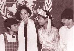 一九九六年六月十一日,聯合國秘書長助理格林女士,親切會見第26屆奧運火炬傳遞手張勝利(右一)、胡晶、讓英。