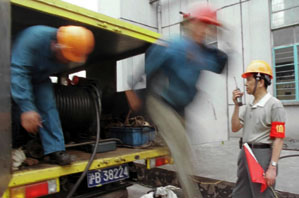 上海市城市排水市北公司的職工們正在進行防汛應急預案的演習。 (新華社)