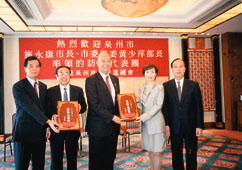 【本報訊】香港泉州慈善促進總會臨時董事局首長昨假北角海逸酒店設宴款待泉州市市長施永康率領的訪港團一行。賓主雙方就即將成立的泉州慈善總會與香港泉州慈善促進總會籌備詳情廣泛交換意見,雙方表示將攜手合作,揭開泉州慈善事業新一頁。