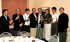 香港浸會大學於日前(五月廿八日)假粉嶺香港哥爾夫球會舉辦第一屆謝志偉校長哥爾夫球盃,經過四個多小時的賽程,終由大學校董會成員鄭恩基(右四)奪魁。其他得獎者包括浸大校長謝志偉(左四)奪最近畫線獎,校友區瑞強(左三)獲發球最遠獎,加拿大置地有限公司董事長葉樹林得最近球洞獎,浸大財務長孫百千獲亞軍(右三),浸大環境健康及安全組主任郭達民(右二)獲季軍。