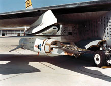 美國太空總署三月十三日發佈的X-43高超音速飛機(火箭前黑色物體)及其改進型「天馬」推進火箭的圖片。它被安裝在NB-52B運輸機上,然後由運輸機攜帶到高空發射。 (法新社)