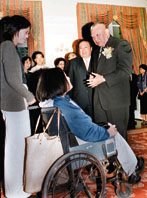 行政長官與其中一位藝術家、畫家廖東梅傾談。