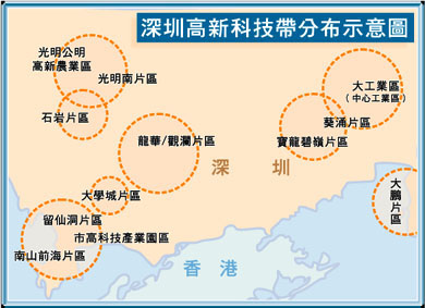 為實現「高科技城市」之夢,深圳還提出建立一個高新技術產業帶。《深圳市高新技術產業帶規劃綱要(討論稿)》將提交此次會議審議。張高麗稱這是深圳繼高交會之後的又一力作,「相當於再造一個深圳」。這個產業帶全長一百公里,將從根本上解決深圳高新技術產業發展空間不足的問題。到二○○五年,這個產業帶的工業產值預計可達二○○○億元,到二○一○年將達四千億元。