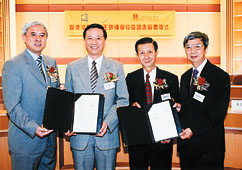 浸會大學校長吳清輝(左二)、金城營造集團主席王錦輝(右二)及副主席兼董事總經理王國強(右)與浸大社科院院長傅浩堅在捐贈儀式上。