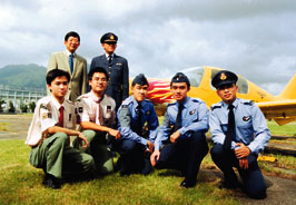 馮教授(後左)和香港航空青年團司令梁冠平上校與參加航空課程的學員合照。