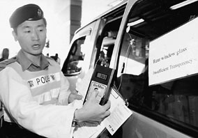 交通警員展示如何檢測車窗的透光度。