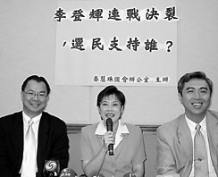 親民黨籍「立委」秦慧珠(中)二十一日公布「李登輝、連戰決裂,選民支持誰?」的民意調查結果。國民黨籍「立委」陳學聖(右)與李先仁(左)也應邀出席,評論李政團對各政黨的影響。 (中央社)