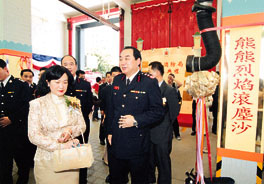 消防處處長許競平向葉劉淑儀介紹廢氣處理系統。