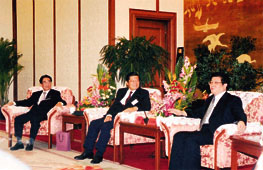 全國政協副主席、中央統戰部部長王兆國(右)接見了代表團,中為湯恩佳團長,左為脫志賢副團長。