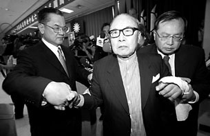 夏功權(中)割腕,血濺發言台,連戰(左)立即上前安撫。夏功權由張哲琛(右)護送到台大醫院急救。(中央社傳真)