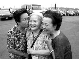 旅居廈門的金門籍老人返鄉探親團直航抵達金門進行四天三夜探親之旅,七十六歲的林柳(原名楊梅)老太太(中),與歡迎的大姊楊愛珠(左)、妹妹楊彩華(右)緊緊擁抱在一起。 (中央社傳真)