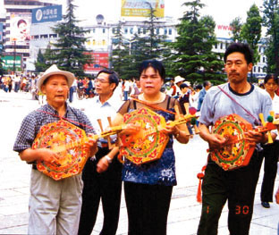 每天清晨,昆明鬧市區的東風廣場上,許多百姓自編自唱自彈養身怡心。 (攝影:和向紅)