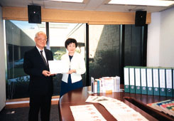 吳康民向香港中央圖書館總館長脫新範女士捐贈手稿。桌面上置放的是吳康民捐贈的藏書及本人著作和手稿。
