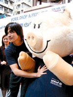昨日記者所見,扮PORK CHOP兩隻小豬分別是一男一女,想不到東東這個大頭蝦卻不知道女小豬是由女仔扮,在打手印活動上,打過手印後,東東一手白色顏料,記者叫他不如印在T-SHIRT上,他卻以為記者叫他再印多個手印在小豬穿的T-SHIRT上,於是順手便捉著旁邊的女小豬PIGGY,用力在女小豬胸上,印下手掌印。