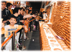 今年的美食博覽依然離不開食品、健康食品、中成藥、餐飲業用品幾個大類。說到美食博覽,我們少不免要「篩選」新奇美味的食品。「」其中一個攤位傳來打鐵般的節奏聲響,循聲而行,原來是售賣新登場「韓式爆餅」攤位,擠滿取餅、圍觀的人群。「」一部形同衝床的機器,從衝壓口飛出一方方六吋渾圓的脆餅。它亦勾起對童年看「爆米花」絕活的回憶,當裝滿爆米的鐵均勻加熱之後,小販以一支鐵通撬開罐蓋,「」地一響,碩大的爆米花飛散,小朋友們嘗之,喜不自孜。「韓式爆餅」亦有異曲同工,美味與否見仁見智,但噱頭已然十足。