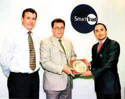 投資推廣署助理署長賈沛年(右)昨日頒發紀念品予Sonera Smart Trust Limited副行政總裁Anders Ingestrom,旁為SmartTrust亞洲區董事總經理Mark Richards。賈沛年歡迎該公司在港擴展地區總部,開發亞太區業務。