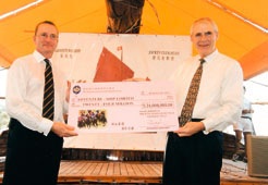 「香港賽馬會」董事艾爾敦(右)將二千四百萬元的支票交予「乘風航」主席布立頓(左)。